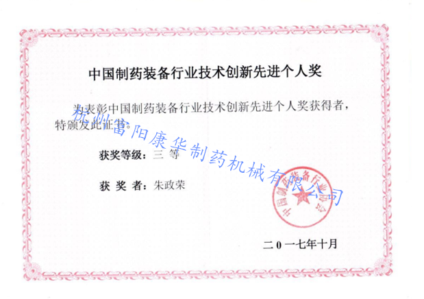 祝賀朱政榮董事長中國制藥裝備行業(yè)技術(shù)創(chuàng)新先進個人三等獎!