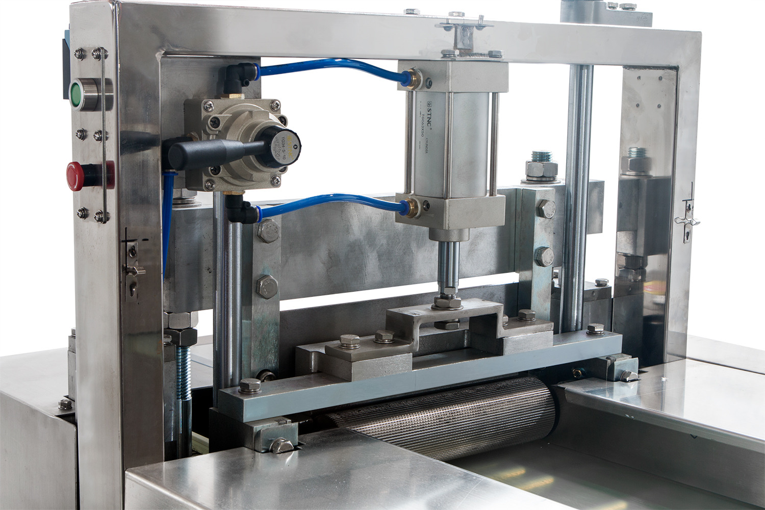 特制的輸送帶和壓料機構(gòu)將物料按設定的長度,作步進平行移動,垂直上下往復運動的切刀機構(gòu)直接在輸送帶上切斷物料。